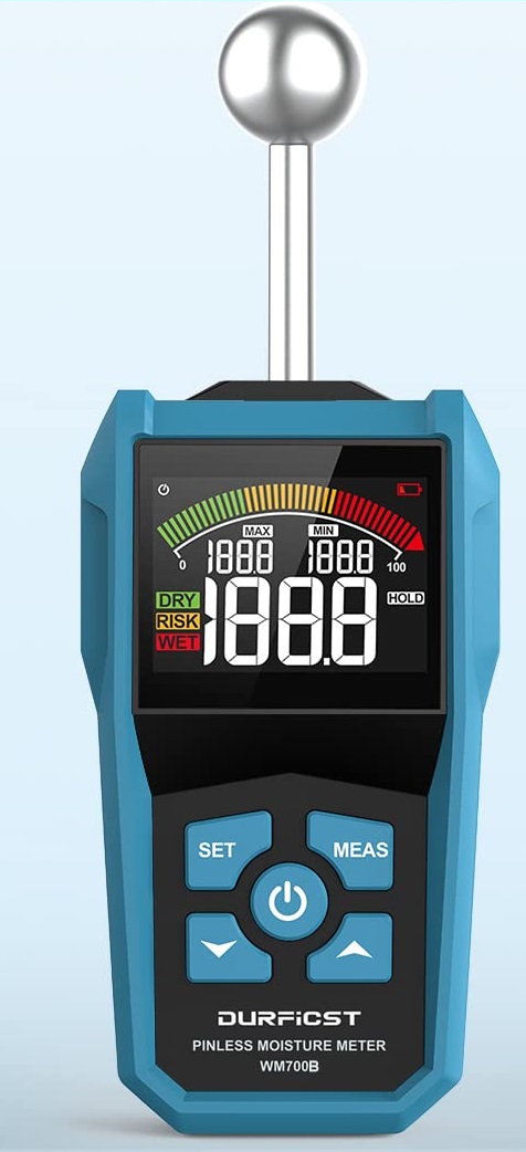 In der Regel werden Kapazitive Messgeräte verwendet, ähnlich dem Beispiel auf diesem Bild. Es gibt auch Geräte, die haben zwei Metallspitzen, welche in das zu überprüfende Material gedrückt werden und dann über eine Widerstandsmessung die Feuchtigkeit bestimmen. Da dies die Oberfläche beschädigt, wird dies nur zum Beispiel für Balken oder Brennholz verwendet.