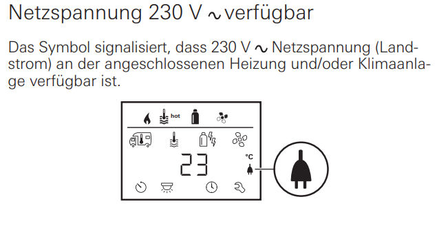 Im Fahrzeug ist irgendwo eine Anzeige woran man erkennen kann ob der Landstrom korrekt angeschlossen ist und zur Verfügung steht. Sehen Sie in der Anleitung Ihres Fahrzeugs nach.
