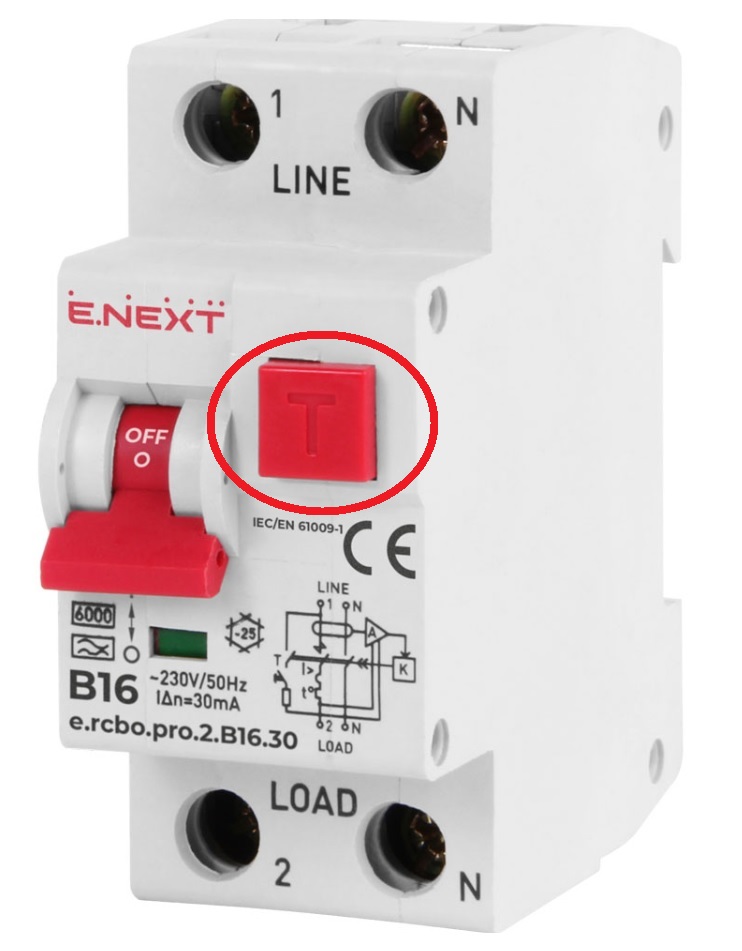 Die Prüftaste (T) leitet einen definierten Fehlerstrom über einen Widerstand um den internen Messwandler herum. Damit wird sowohl die Elektrische als auch die Mechanische Funktion getestet. Siehe das Blockschaltbild auf dem FI Schalter (unteres Foto).