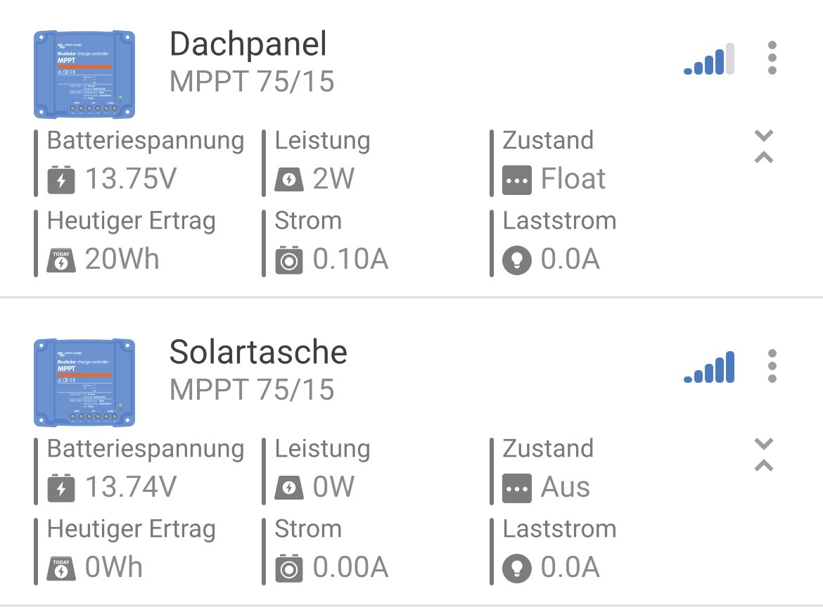Die neue 200w Solartasche liegt ebenfalls über einen zweiten Victron mppt 75/15 direkt auf der Batterie.