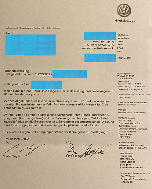 Dies ist aber nicht richtig, der Brief von VW reicht. Für dieses Problem gibt es eine einfache Lösung, wünscht den Mitarbeitern in der Zulassungsstelle eine gute Nacht und fahrt bei euch im Kreis zu einer anderen Zulassungsstelle.