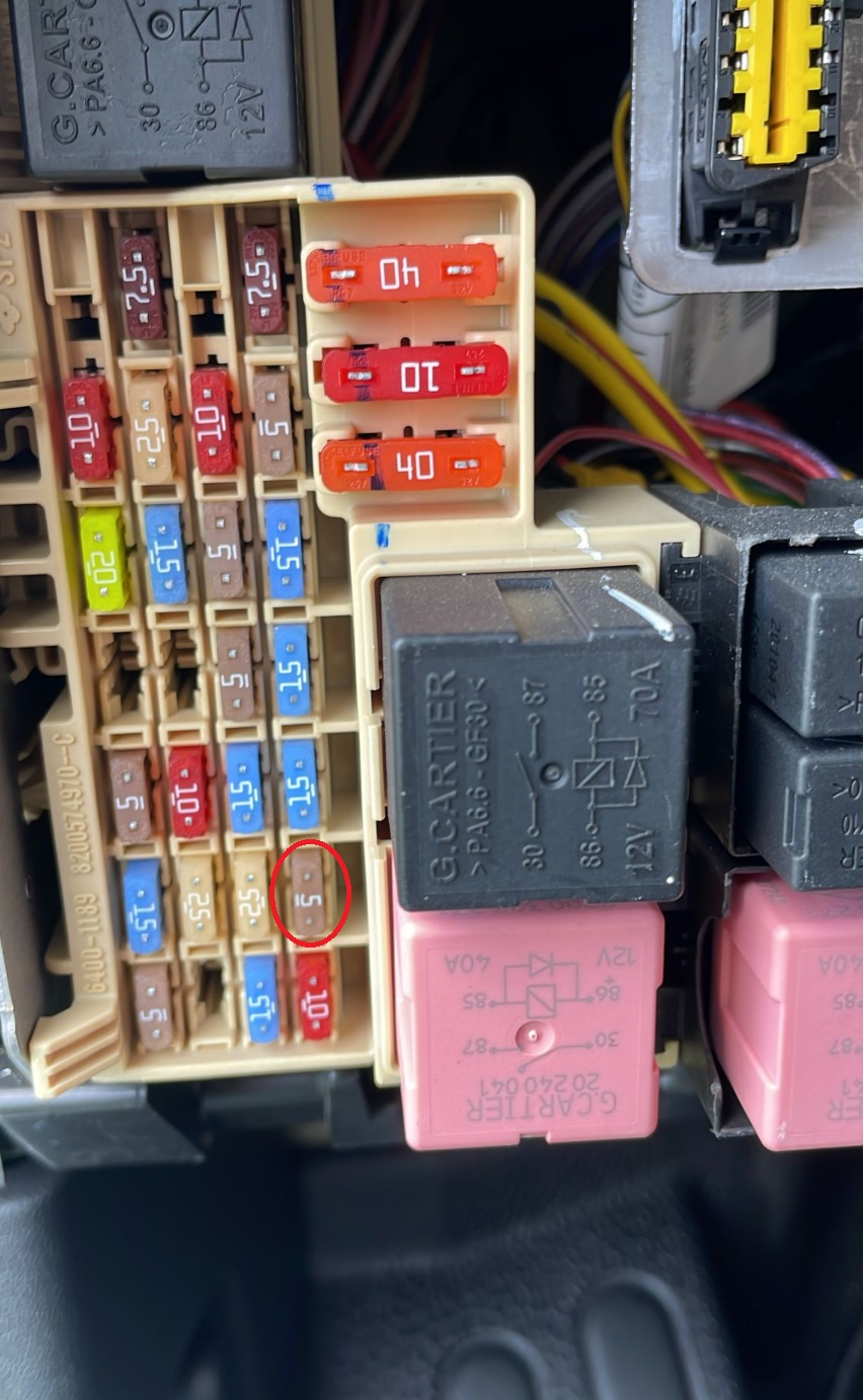 So kann man bei einem Renault Master die AdBlue Warnung resetten. Während die Zündung eingeschaltet ist, rechts, die 2. Sicherung ( 5Ampere) von unten, für einige Sekunden ziehen und wieder reinstecken.