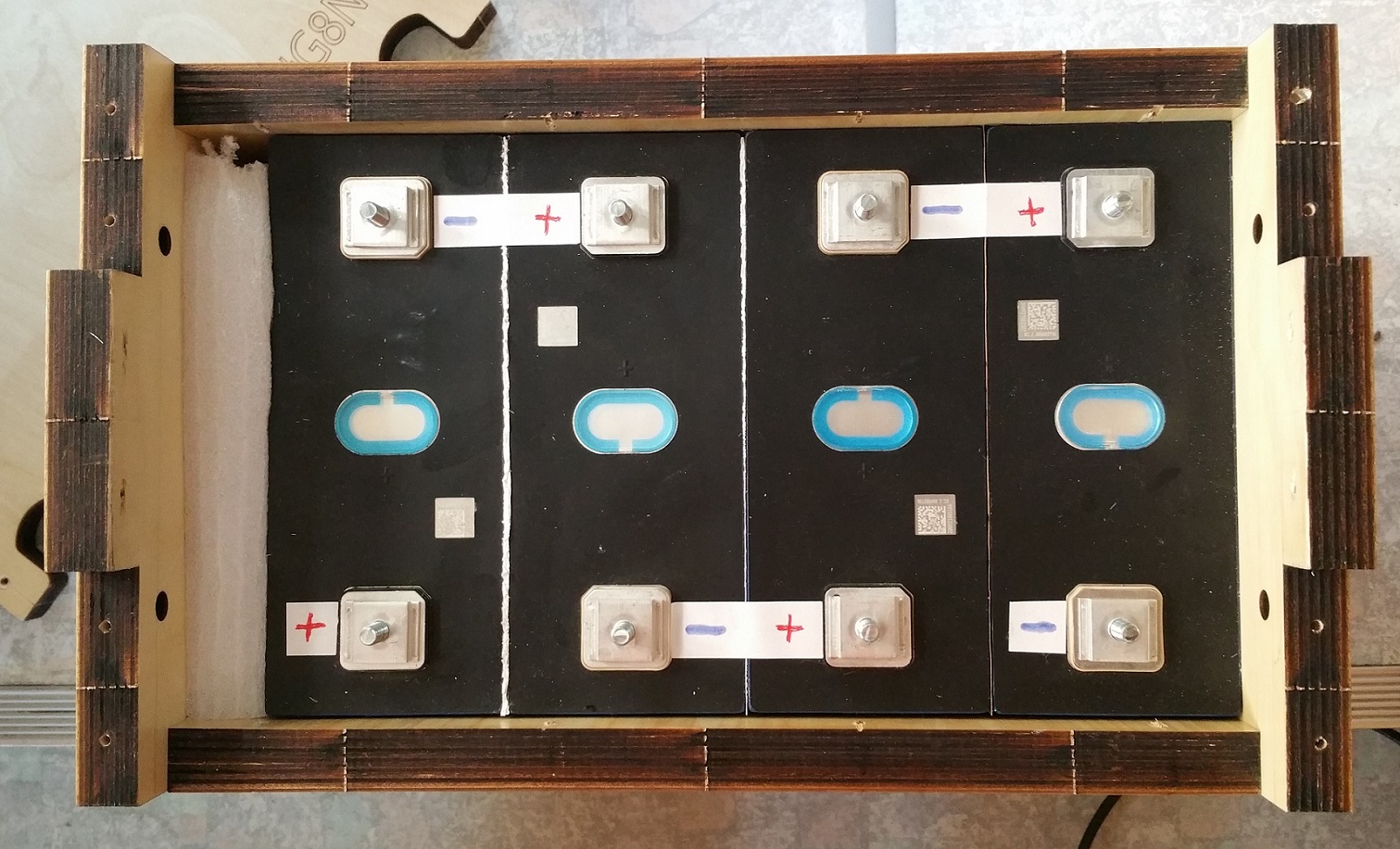 Und wichtig, die Verbinder erst festschrauben, wenn die Zellen in der Box zusammengepresst sind, da vorher noch Abstände zwischen den Zellen vorhanden sind. Sonnst über diese Druck auf die Anschlüsse aus und die Zelle kann im schlimmsten Fall undicht werden.