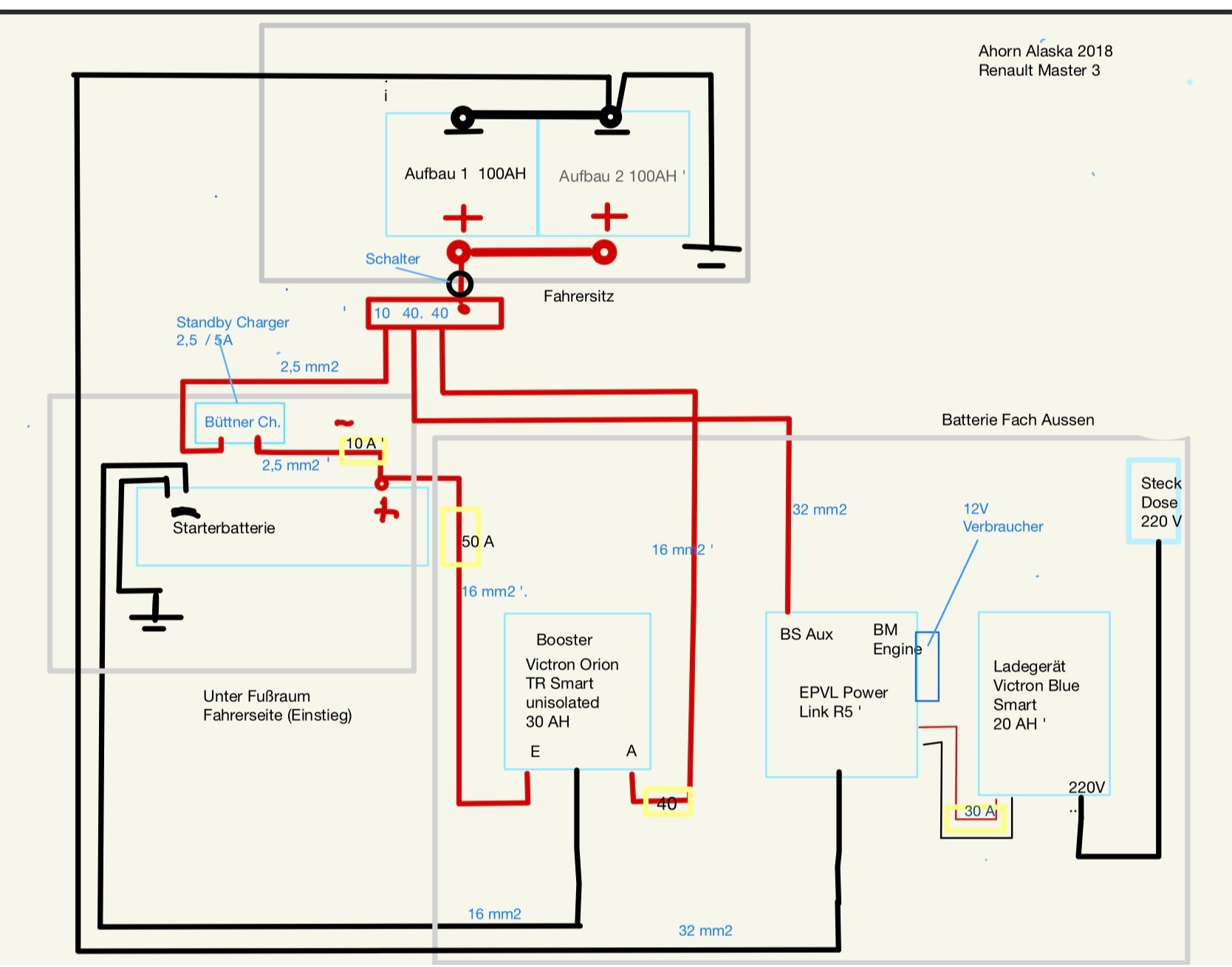 kann mal jemand auf meinen Plan für den Einbau von zwei LifePo4, Booster, neues Ladegerät und Standby Charger schauen ob das So passt.