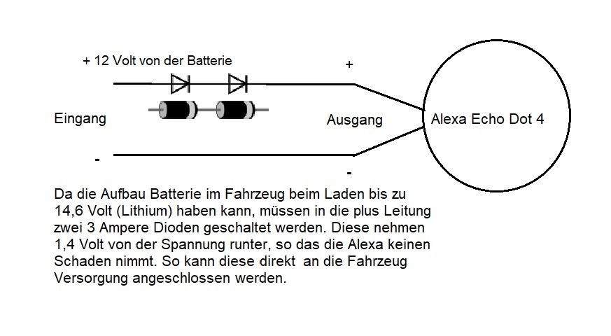 Bei Lithium Batterien schalte ich eine 3 Ampere Diode vor, diese nimmt ca. 0.7 Volt weg, wie in der Anleitung von der Alexa beschrieben, Die Alexa ist empfindlicher, da muss man näher an die 12 Volt kommen.