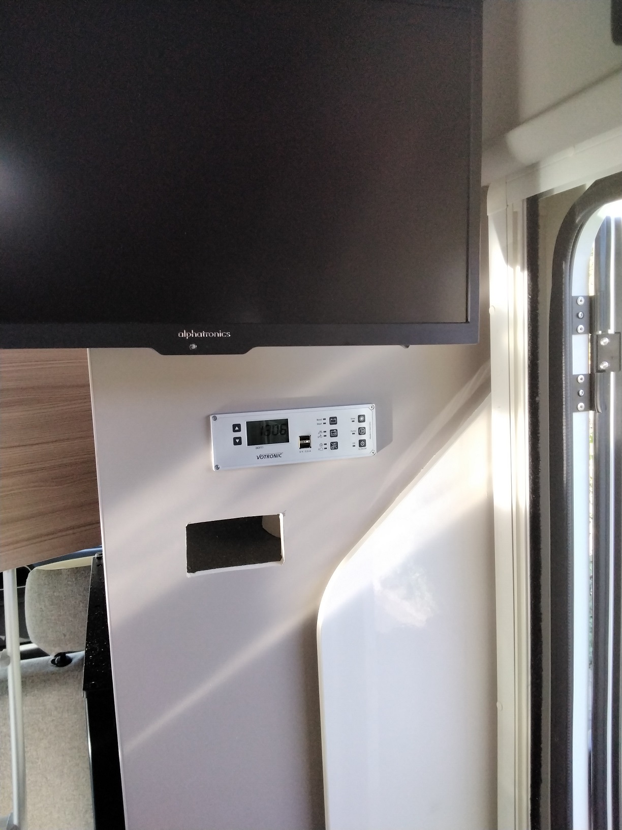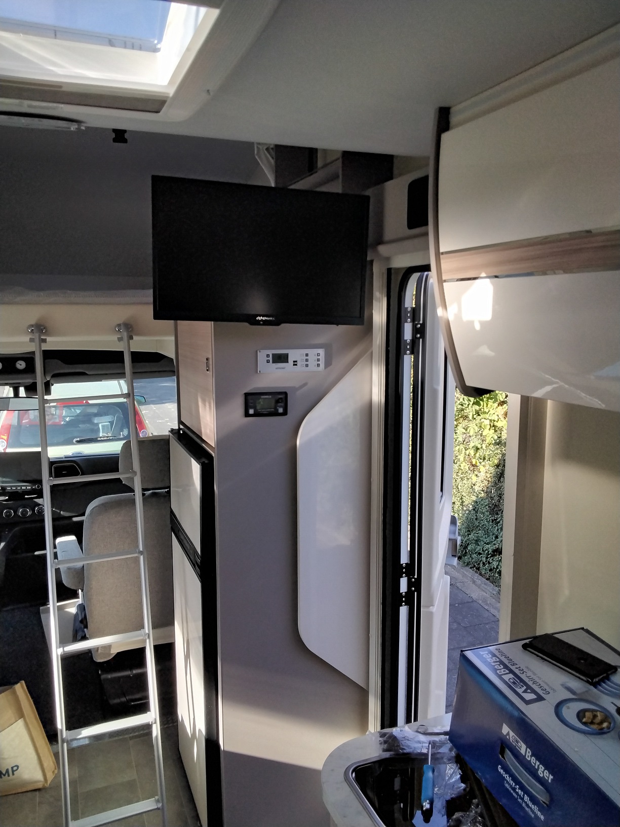 Ich habe in den letzten Tagen unter anderem das TV Gerät eingebaut, einen Druckbehälter in die Wasserleitung eingefügt, dem Kühlschrank einen Doppellüfter spendiert und einiges andere vorbereitet.