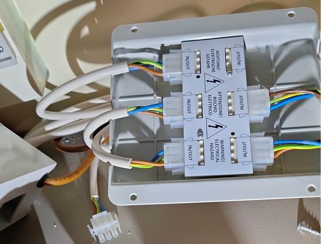 Die 230 Volt Kabel sind in der Dose beim FI Schalter beschriftet, aber auf italienisch Hier die Übersetzung der 230 Volt Leitungen: