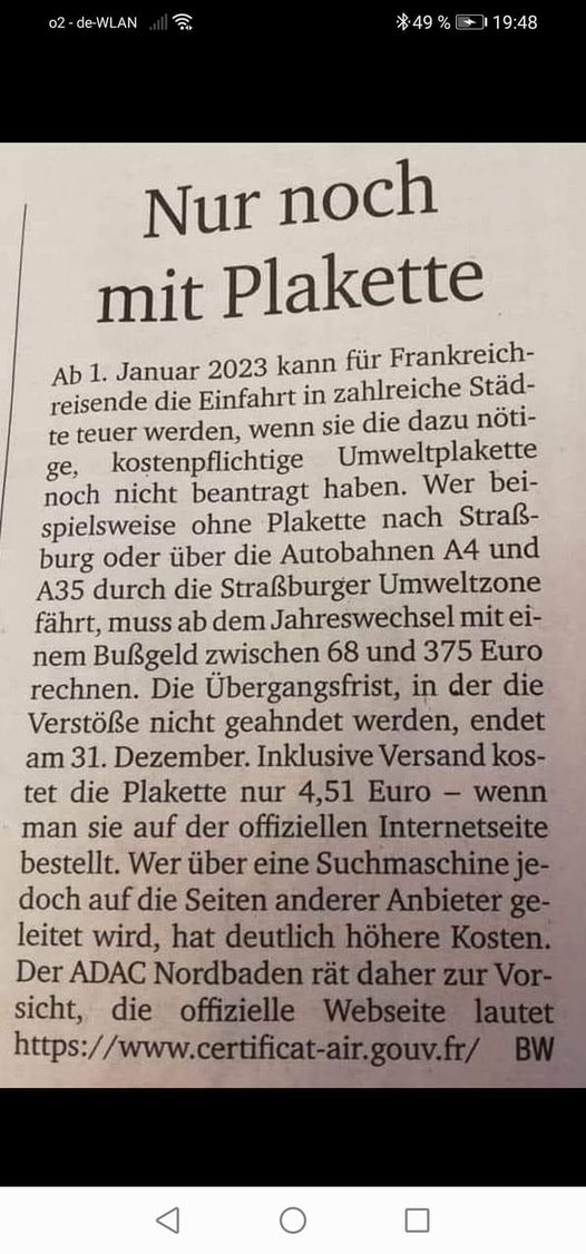 Wozu in Frankreich ein Bußgeld riskieren, wenn die Umwelt Plakette nur 4,51.- € kostet. Einfach auf die Webseite gehen, das Formular ausfüllen und mit gaypal bezahlen.