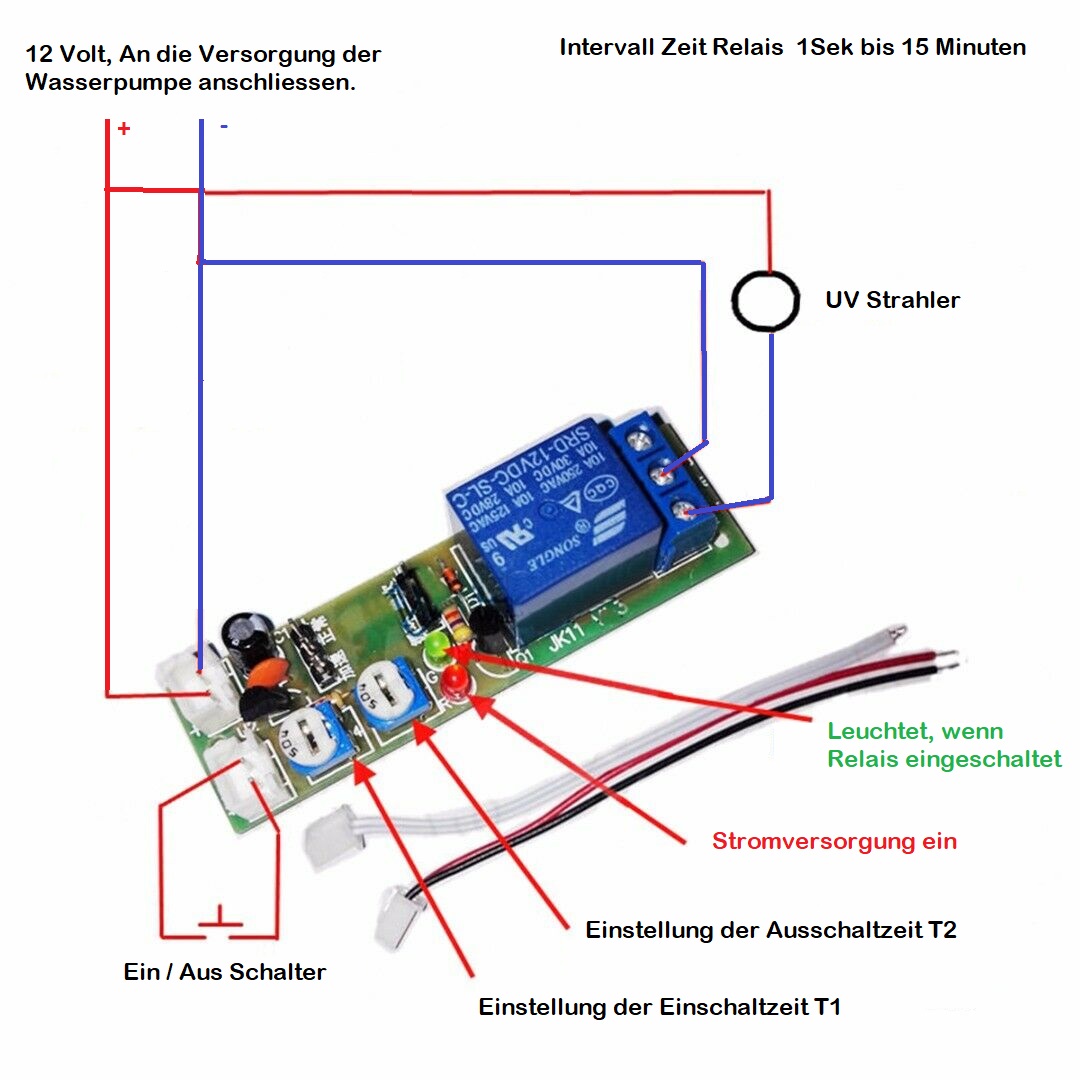 Auf die Timer Platine kann natürlich verzichtet werden. Die 12 Volt Leitung zusammen mit der Wasserpumpe anschließen, so das das Wasser bestahlt wird sobald die Pumpe läuft.
